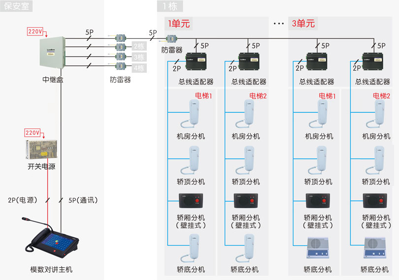 基于總線制傳輸方式,專用于小區(qū)保安室、監(jiān)控管理中心與電梯轎廂、電梯控制機(jī)房、電梯轎頂、電梯轎底之間的求助報(bào)警、對(duì)講等的電梯五方對(duì)講系統(tǒng)。專用于電梯場所的五方呼叫、對(duì)講。
